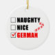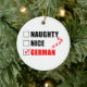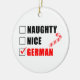 Naughty Nice German Santa Checklist featuring a cartoon candy cane. A funny Christmas ornament for a German household.