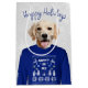 Golden retriever with a NAUGHTY OR NICE text on an ugly sweater.