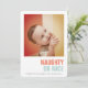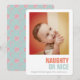 This simple and modern "naughty or nice" christmas holiday photo card features a white background with siple bold letterings in salmon red and light blue. The reverse side features a light blue background with patterns of candy canes. Personalize for your needs. You can find matching products at my store.
