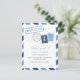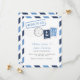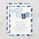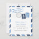 Airmail Inspired Save the Date Card in Navy and Powder Blue. Faux Stamp and Postage Markings for a Travel and Nautical Themed Wedding.