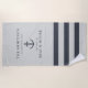 Nautical beach towel features a coastal style boat anchor and stripes design. Personalize the custom text with a family last name and beach house (or other title) with the year established and location. Hale navy blue and sea salt colour scheme.