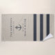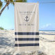 Nautical beach towel features a coastal style boat anchor and stripes design. Personalize the custom text with a family last name and beach house (or other title) with the year established and location. Hale navy blue and accessible beige scheme.