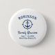 A nautical themed family reunion button, proudly displaying your family name, reunion date and location in elegant calligraphy script with stylish modern text. This design features artwork of a custom boat anchor with a compass style boarder in navy blue on white or easily customize the background to any desired color.