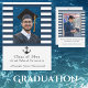 A modern nautical Navy Blue and White stripes graduation Announcement featuring a frame over your choice of photo. The backside features another photo and more details about your graduate.