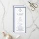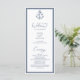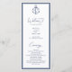 This elegant nautical wedding program features an anchor monogram at the top with the initials of the bride and groom, with a navy blue double frame, a white background and navy blue classic elegant text with script calligraphy.