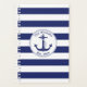 This nautical planner has a navy blue anchor with a circular rope border. Personalize with your own family name and year of establishment, or replace with other text. Background is navy blue and white stripes.