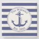 This nautical design on this coaster has a navy blue anchor with a circular rope border. Personalize with your own family name and year of establishment, or replace with other text. Background is navy blue and white stripes.