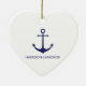 Custom Boat name, family name, couple's names or initials nautical anchor navy blue and white heart Christmas ceramic ornament.