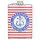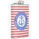 NewparkLane - Modern design, personalized flask, with a red striped pattern and a navy blue anchor in a blue circular frame. Easy to customize with your name and favourite city. All text style, colours, sizes can be modified to fit your needs.