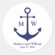 Nautical anchor navy blue and white custom monogram initials, names and date wedding modern elegant chic gift favour Classic Round Stickers.