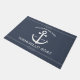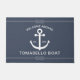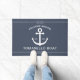 Add your boat name with anchor, rope, modern typography and navy blue welcome mat.