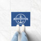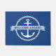 Door mat featuring a white nautical anchor surrounded by a rope border on a dark blue background. Across the anchor is a light blue banner with customizable text "welcome aboard".