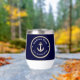 Nautical Boat Name Anchor Rope Navy Blue White Family name and Lake/Ocean/River location thermal wine tumbler. Perfect Gift for any boat, lake house, or beach house owner.