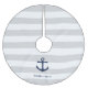 Add a coastal touch to your holiday decor with our Christmas tree skirt featuring wide nautical grey and white stripes and a navy blue ship's anchor illustration. Personalize with your family name beneath in matching navy.