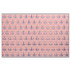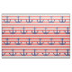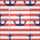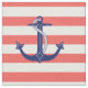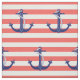 This nautical themed fabric features a repeat of navy blue anchors on a coral and white striped background.