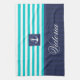 Nautical kitchen towerl with turquoise & navy blue striped pattern and customizable text.