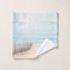 Patterned towel set wwith a beautiful rustic image. Subtle colours of light blue, sandy brown and gentle white. A beach scene with a boat on the shore with a fishing net hanging off the side. An elegant shabby look.