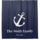 This midnight blue shower curtain features a large white anchor. This nautical shower curtain also has a place to enter your personalized text.