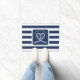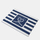 Nautical blue and white striped wedding newlywed doormat. Great housewarming decoration for a Navy (military) veteran couple or lake house. Design features a heart shaped rope with anchor and couple initials in the middle. Personalize it with your wedding details.