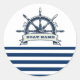 Nautical Boat Wheel, Navy Blue White Stripes Classic Round Sticker