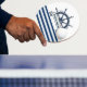 This image features a boat wheel, an anchor on a navy blue and white striped background.