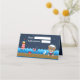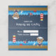 This cute and fun seating place card features a nautical sailor boy bear on a wooden deck with a seagull and a crab. In the background there is a red and white lighthouse, a cute bird on a sailboat, ocean waves and a navy blue starry night sky. The text combines bold and serif fonts for a stylish and modern look. This is perfect for a nautical themed birthday party.