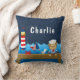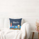 This cute and fun pillow can be personalized with a name. It features a nautical sailor boy monkey on a wooden deck with a seagull and a crab. In the background there is a red and white lighthouse, a cute bird on a sailboat, ocean waves and a navy blue starry night sky.