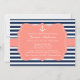 Invitation classique à thème nautique, idéale pour une douche ou un baby shower nuptiale. Un joli petit ancre, des rayures marines, un ruban de corail et un cadre en font le choix idéal pour vos fêtes nautiques, estivales ou sur la plage !