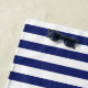 Personalize this nautical Captain's beach towel with your name. Design features a drawing of a navy blue anchor with rope in the centre and navy blue and white stripes above and below.