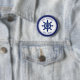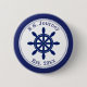 Personalize the boat name and year of establishment on this nautical button featuring a navy blue captain's wheel with a circular rope border.