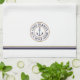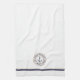 Nautical Chef personalized anchor logo kitchen towel with your name and boat name. White with navy blue and tan brown circle emblem with classic block text. Double navy blue and tan brown lined border.