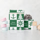 Seamless, repeating vector graphic nautical at Christmas green and white colours with anchor, ships wheel, and christmas tree pattern. Customizable: you can choose any other background colour instead of green. Add your name, edit or delete text.