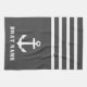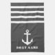 Custom Nautical Classic Anchor with Your Personalized Boat Name on a Stylish Grey Kitchen Towel with White stripes.
