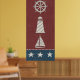 A navy blue and red star design featuring aan anchor, lighthouse and lifepreserver.