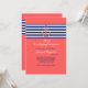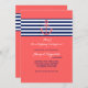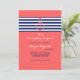 A lovely nautical invitation with a feminine touch of colour. The card features a rose-red background with a blue and white stripe band and an overlaying anchor. It's suitable for just about any occasion.
