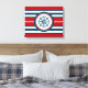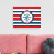Nautical design with compass decoration in round shape on red, blue and white striped background