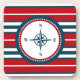 Nautical design with compass decoration in round shape on red, blue and white striped background