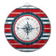 Nautical design with compass decoration in round shape on red, blue and white striped background