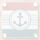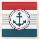 Nautical design with anchor decoration in round shape on blue, red, grey and white striped background