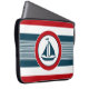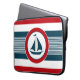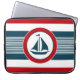 Nautical design with sailing boat decoration in round shape on blue, red and white striped background
