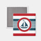 Nautical design with sailing boat decoration in round shape on blue, red and white striped background