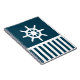 Nautical design with sailing wheel and blue and white stripes decoration on blue background