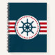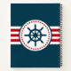 Nautical design with sailing wheel decoration in round shape with stars on red, blue and white striped background