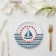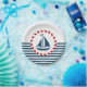 Nautical design with sailing boat decoration in round shape on blue and white striped background