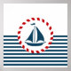 Nautical design with sailing boat decoration in round shape on blue and white striped background