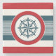 Nautical design with compass decoration in round shape on blue, red and white striped background