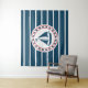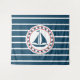 Nautical design with sailing boat decoration in round shape on blue and white striped background