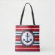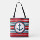 Nautical design with anchor decoration in round shape on red, blue and white striped background