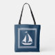 Nautical themed design with sailing boat decoration in striped squares on blue background