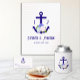 Nautical anchor and monogram framed by a lightened version of patriotic florals: white rose, blush pink peony and light blue. Preppy pink and white stripes for a summer, beach, or destination wedding event.